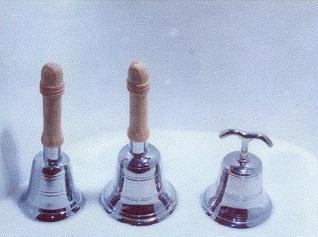 Campainhas de páscoa em metal com cabo de madeira e metal.